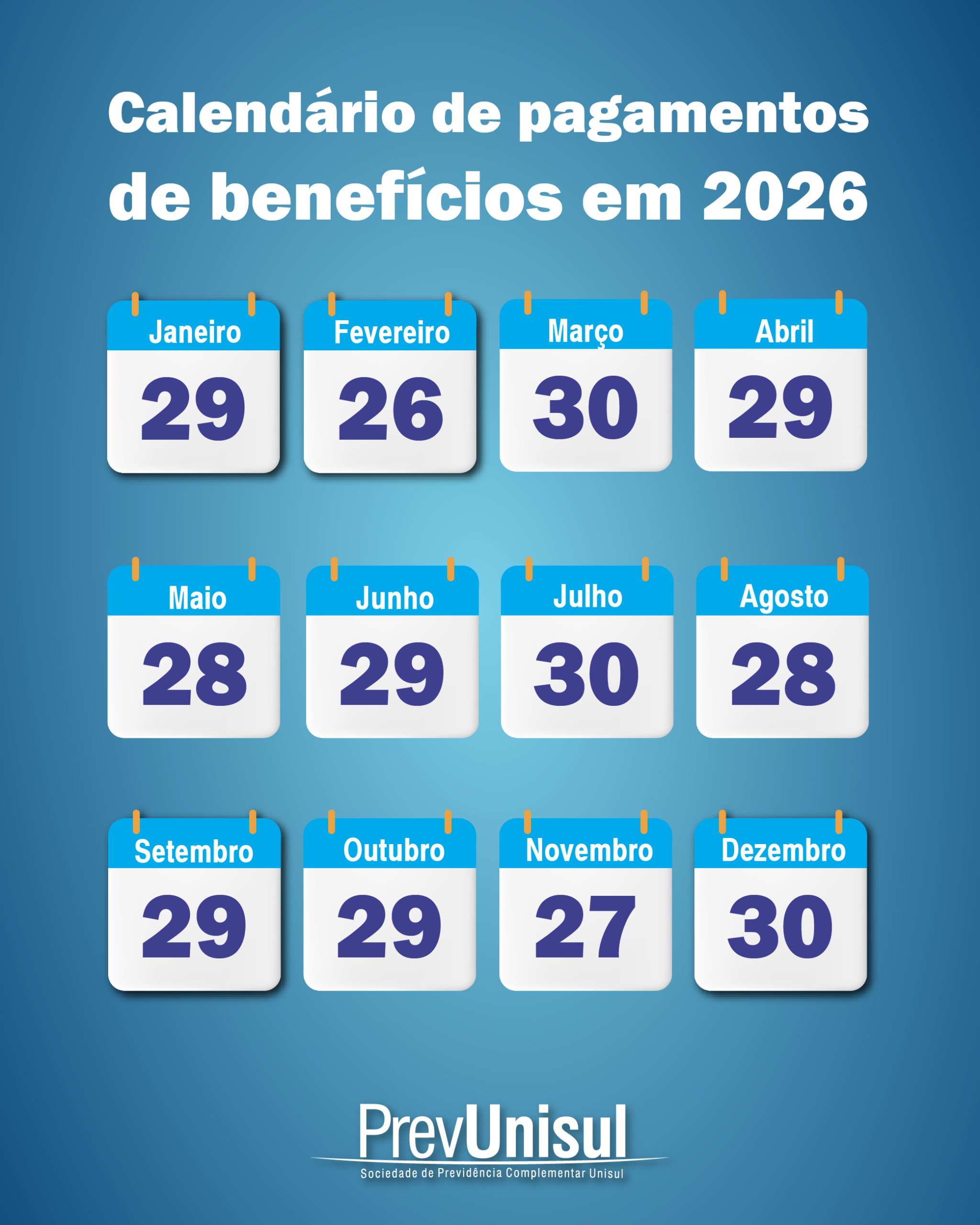 Dia Mundial da Poupança – 31 de outubro View Larger Image Mariana Alcântara2018-10-31T10:36:26-03:0031/10/2018|Notícias, PrevUnisul| Postagens Relacionadas Calendário de pagamentos de benefícios em 2026 Galeria Calendário de pagamentos de benefícios em 2026 Dia do Aposentado 2026: participe do evento on-line da Abrapp em 29/01 Galeria Dia do Aposentado 2026: participe do evento on-line da Abrapp em 29/01 Informe Mensal de Rentabilidade – Dezembro/2025 Galeria Informe Mensal de Rentabilidade – Dezembro/2025 Recadastramento – Prova de vida 2025/2026 da PrevUnisul Galeria Recadastramento – Prova de vida 2025/2026 da PrevUnisul Fale com a PrevUnisul: conheça seus canais de atendimento Galeria Fale com a PrevUnisul: conheça seus canais de atendimento